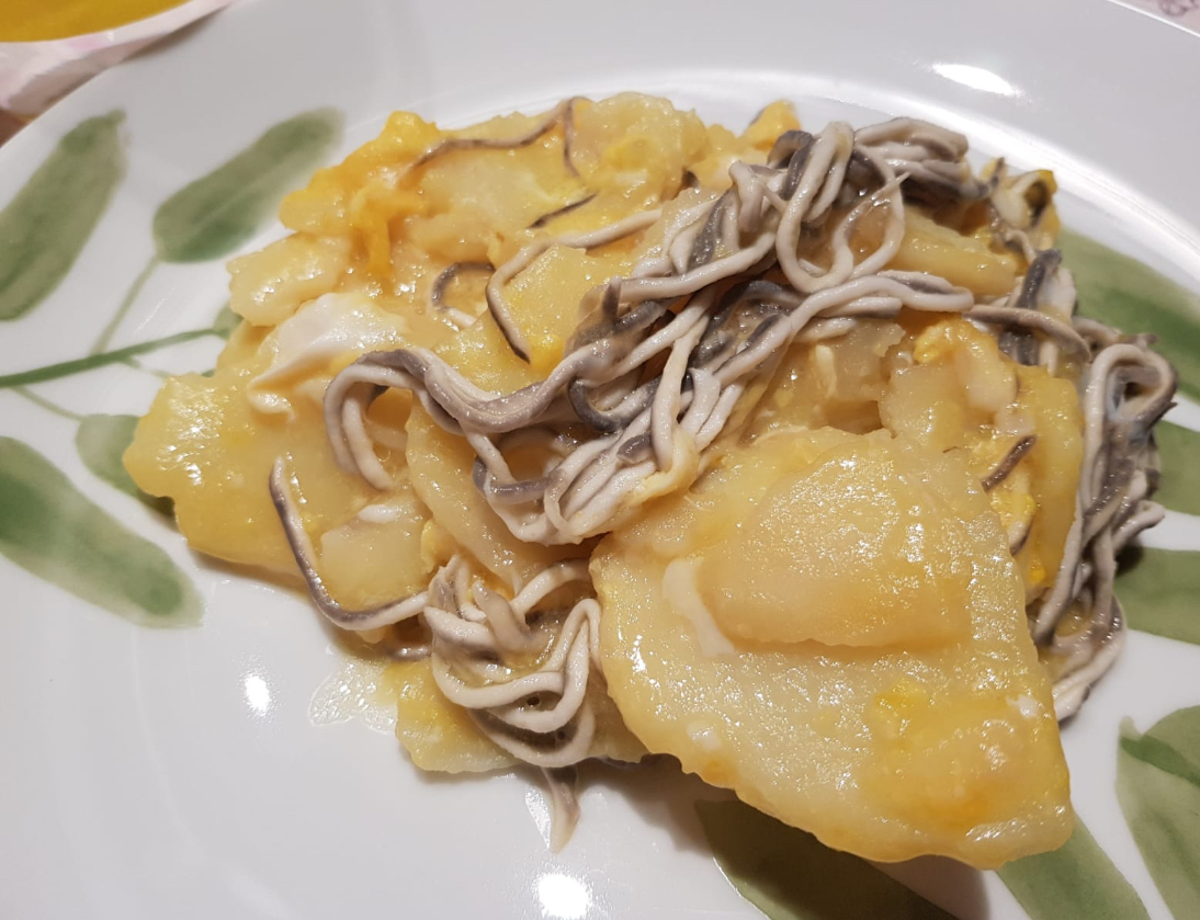 Huevos rotos con patatas y gulas.