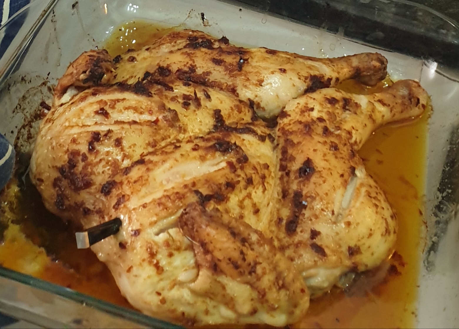 6_Abra el pollo y de la vuelta para que las pechugas queden hacia arriba y presione fuertemente las pechugas y muslos para que el pollo quede plano. Colóquelo en una fuente de horno y, con un cuchillo afilado, haga dos cortes en cada muslo y en cada pechuga. Agite la marinada del tarro para que quede bien mezclada y vierta aprox. la mitad sobre el pollo. Con las manos o con un pincel de cocina frote todo el pollo para que quede bien impregnado de la marinada. Cubra con film transparente y reserve el pollo y el tarro con la marinada restante en el frigorífico durante un mínimo de 5 horas.