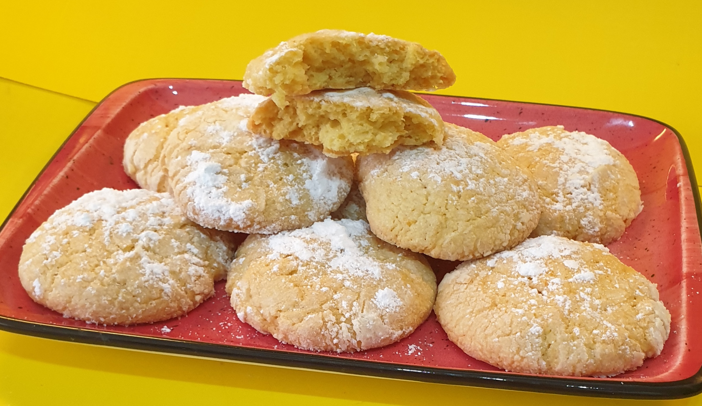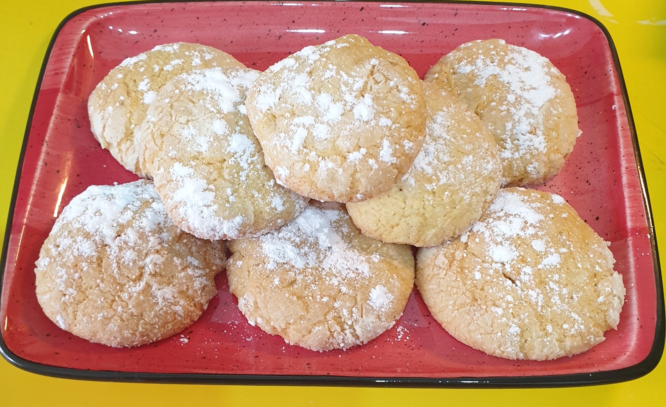 8. Hacer con la masa un cilindro, cortar en 10 partes y a su vez, cada rodaja en dos. Formar bolitas y rebozar en azúcar glas, colocarlas en la bandeja de horno, previamente forrada con papel de horno. Aplastar ligeramente con la palma de la mano.