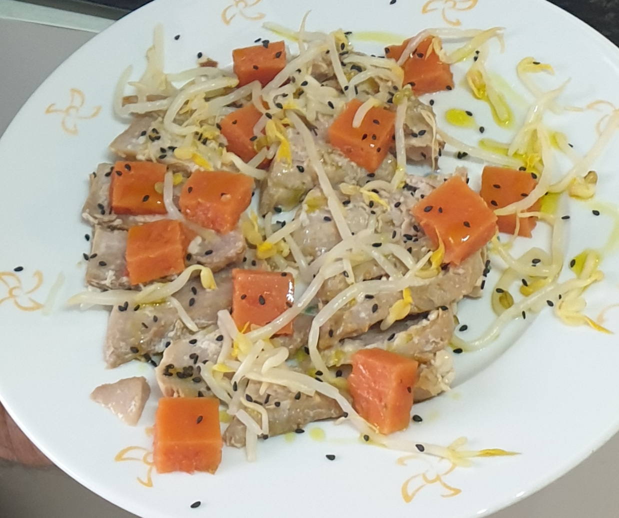 Desmolde la gelatina de tomate y córtela en dados de aprox. 1½ cm. Separe los trozos atún en lascas y colóquelas en 6 platos. Reparta los dados de gelatina, esparcir los brotes de soja escurridos, espolvoree el sésamo negro, riegue con aceite de oliva y unas gotas de vinagre, sirva.