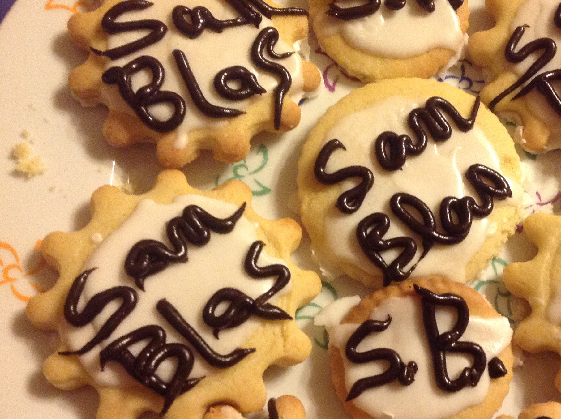 *Trocear el chocolate y fundir en el microondas o al baño maría. Meter en una manga pastelera pequeña, o utilizar un lápiz de repostería o similar de chocolate y escribir "SAN BLAS".