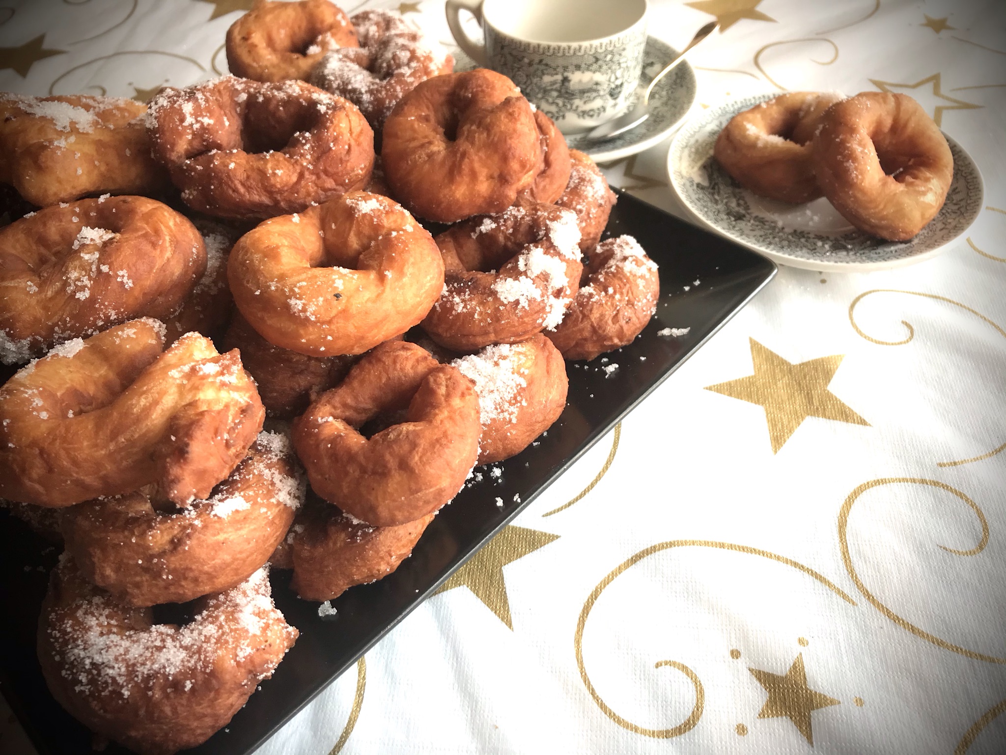 Sacamos la masa del vaso y formamos las rosquillas, las dejamos reposar una hora sobre una bandeja y las freímos en aceite de girasol no muy caliente