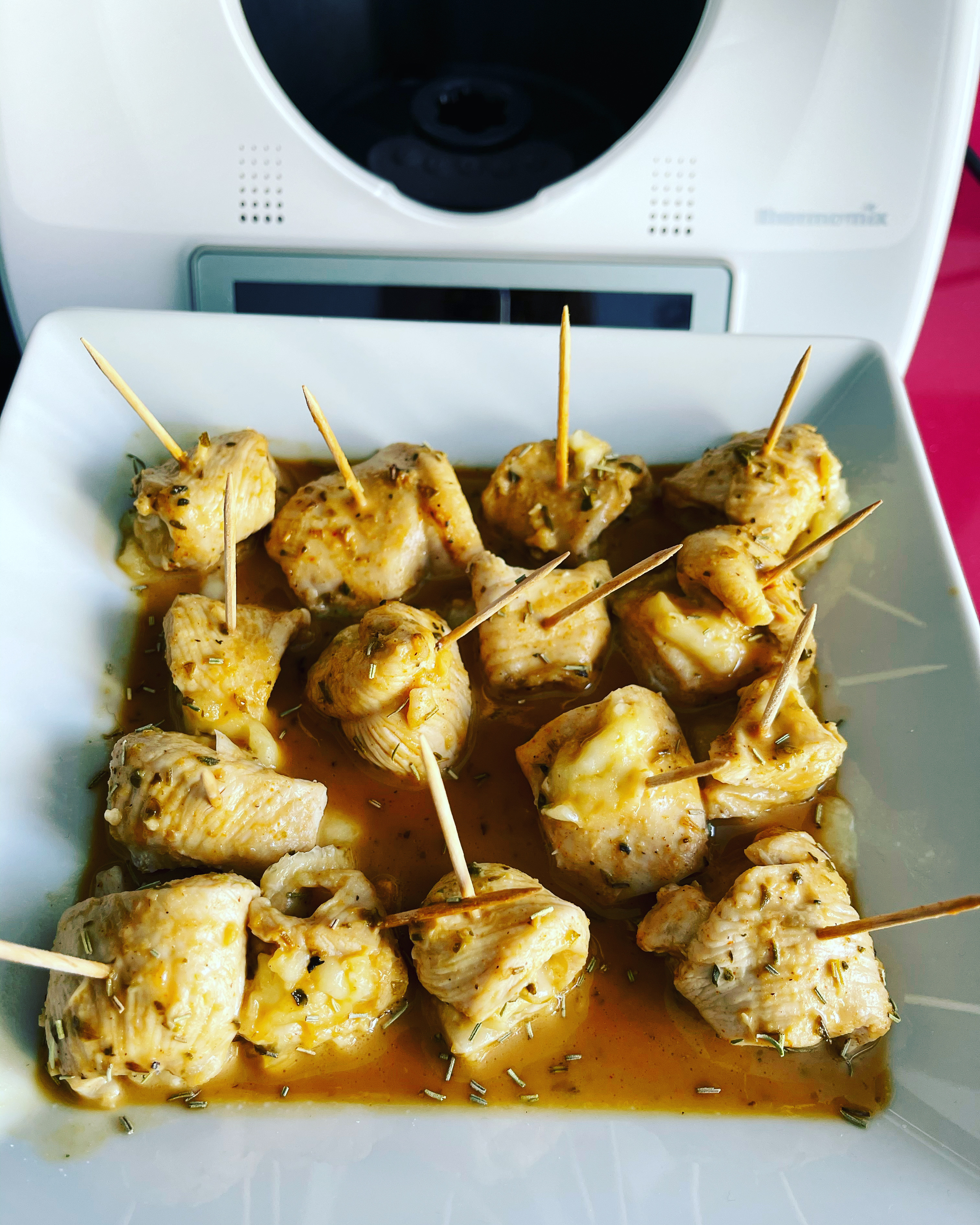 Yo personalmente hice mi propia modificacion de la receta sustituyendo las ramitas de romero por queso en lonchas... no tenia romero en rama solo seco y lo espolveree al finalizar la receta.